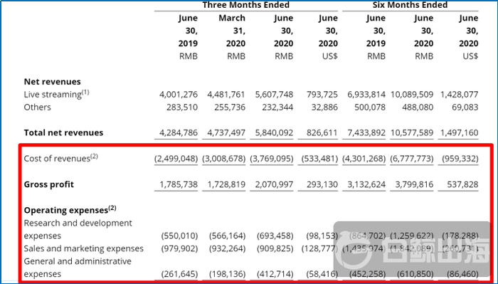 再来看欢聚 Q2 的支出,2020 年 Q2 营收成本为 37.691 亿元,同比增长 50.8%,主要原因是直播分成、内容成本和带宽成本的增加。财报显示,由于疫情的原因用于海外市场的营销成本有所减少,但为了提供更好的服务,所以加大了科研投入并增加了员工人数和人才招聘方面的投入。