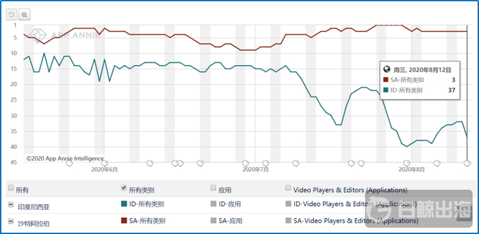 2020年5月14到8月12日Likee在印尼和沙特市场的下载榜排名变化 数据来源:App Annie