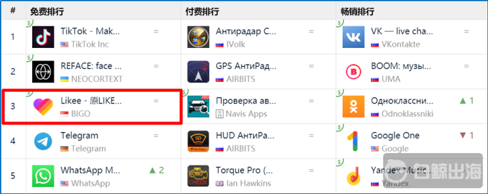 俄罗斯应该是 Likee 目前重点发力的市场之一,根据财报数据,Likee 在俄罗斯市场月活同比增长近 1倍。目前位列俄罗斯 Google Play 非游戏应用下载榜第 3 名。