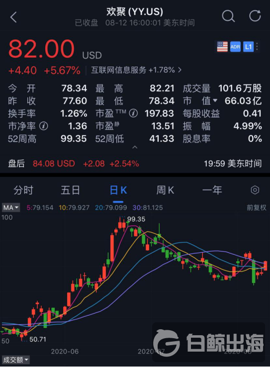 北京时间 2020 年 8 月 13 日晨间,欢聚集团公布了 2020 年 Q2 财报,财报发布当天股价较上一个交易日增长 5.67%,财报发布后股价又上涨了 2.54%,最高达 84.08 美元。