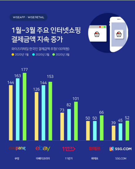 2020年4月,WiseApp公布了韩国第一季度线上购物预估交易额,数据显示,2020年头三个月Coupang的交易额均超过了eBay韩国。
