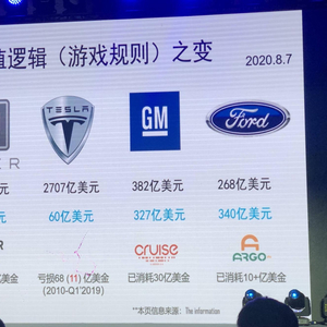 我们都说,华尔街往往最能够敏感嗅到行业变局中的机会。上图灰色的部分是Waymo、Uber、特斯拉、GM、Ford这五家公司在今年8月份的市值或估值,蓝色的数字是它们2020年第一季度的营收。特斯拉的市值相当于去年同期的好几倍,其他几家的市值或估值都有不同程度的降低。Waymo是做自动驾驶最好的,其他公司也有很强的团队在做。为什么特斯拉可以脱颖而出?