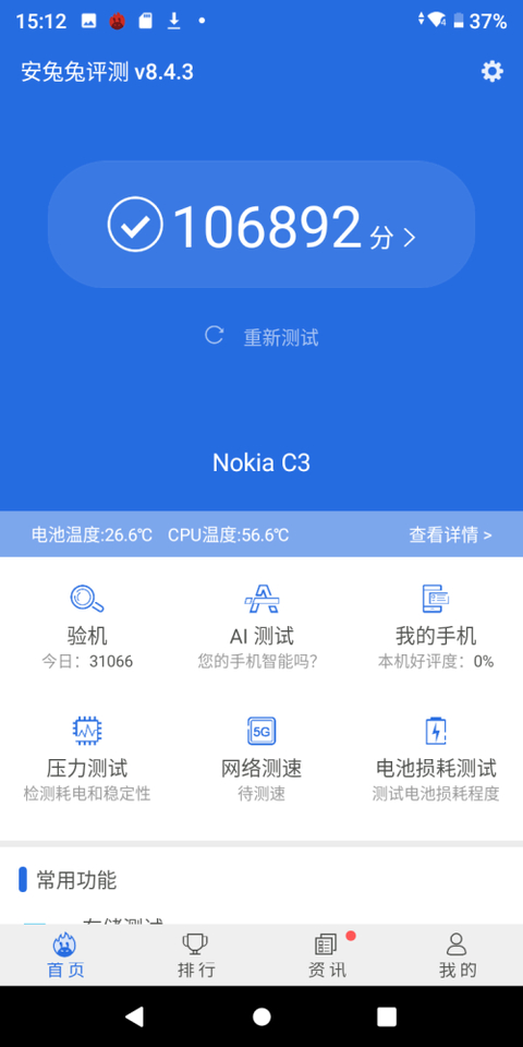 值得一提的是,Nokia C3采用的是国产紫光展锐SC9832E芯片,主频1.4Ghz,它采用28nm工艺制造,拥有四颗A53核心,我们还是来跑个分,我手上这台Nokia C3的安兔兔跑分成绩为106892,放在百元机里属于正常发挥,完全能够满足老年人聊微信、听音乐、刷短视频等轻度使用需求。