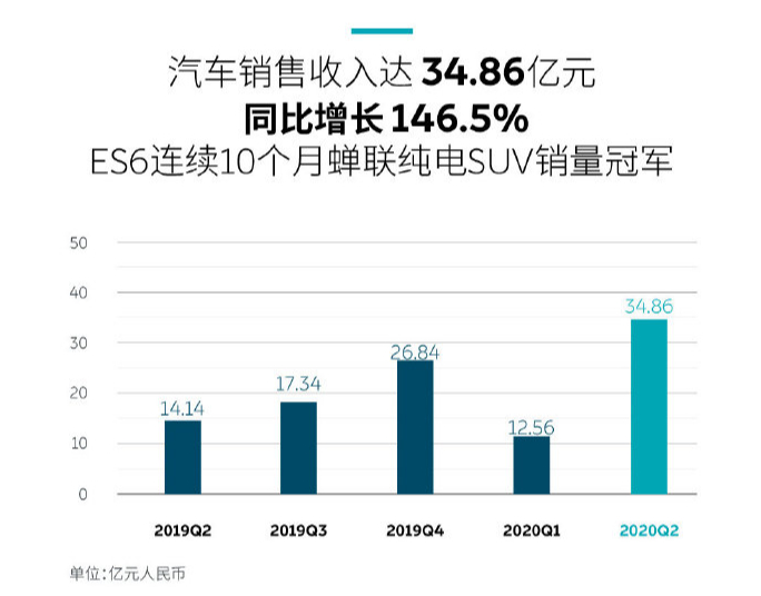 2020年二季度,蔚来汽车收入更是达到了34.86亿元,同比增长达146.5%,其中蔚来ES6更是连续10个月蝉联国内纯电SUV的销量冠军。这还是在疫情之下。