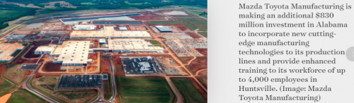 2018年,马自达和丰田宣布,计划将双方的合资工厂建设在美国阿拉巴马州(Alabama)的亨茨维尔市(Huntsville),总投资额约为16亿美元。工厂计划于2021年投产。