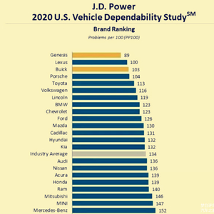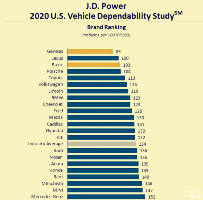 大众汽车。大众汽车在J.D.Power的榜单中位居第六位,每100辆大众旗下的车型,会出现116个故障数,整体表现是非常领先的。而在我们国内,大众汽车的销量表现一直是遥遥领先,年销量一直在几百万辆,所以大众汽车也是国人最认可的合资车品牌之一。