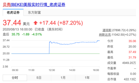 贝壳找房首日开盘价35美元,高开75%,收盘股价报37.44美元,涨幅87.2%,市值422.13亿美元(2930亿人民币)。