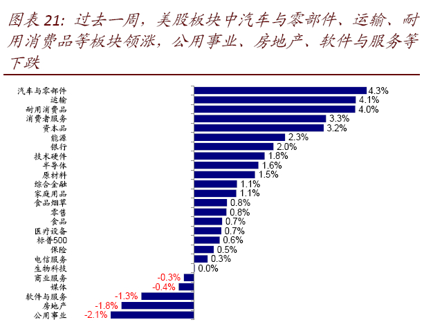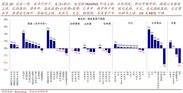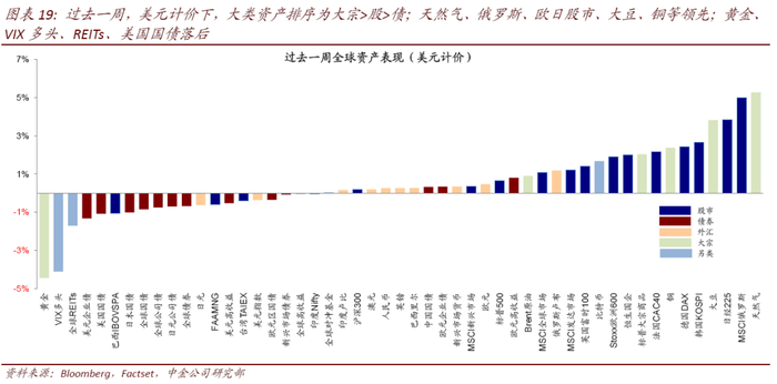 过去一周,美元计价下,天然气、俄罗斯、欧日股市、大豆、铜等领先;黄金、VIX多头、REITs、美国国债落后。受公共卫生事件回落和数据向好推动,美债利率快速抬升15bp,实际利率尤为明显,导致黄金大跌。风格上,美股价值板块继续领先,如汽车、运输、资本品等。