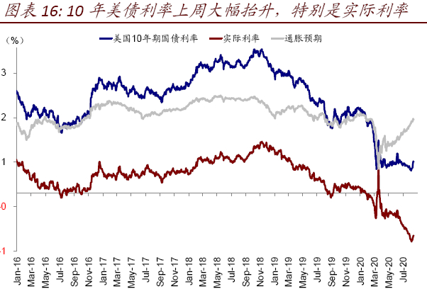 过去一周,海外市场较突出的变化是美债利率快速走高,10年美债跳升15bp到0.7%以上,尤其是实际利率。这一背景下,黄金周二跌幅一度高达6%。与此同时,美股市场上价值风格继续领跑成长板块。虽然有诸如俄罗斯疫苗进展等事件性的催化剂,但