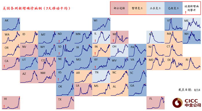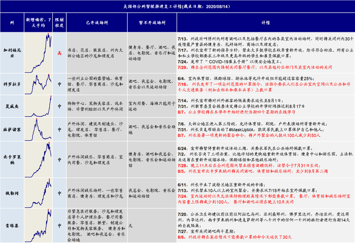 过去一周平均新增确诊降至5.2万人,死亡人数、检测阳性率和R0整体走低。逆转复工州持平于10个,暂停州相比上周的13个增加至14个。欧洲的西班牙和法国抬升尤为明显,加州和佛罗里达也有所抬升。