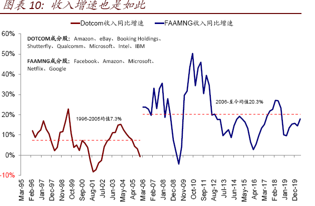 ii. 基本面集中度远高于当时。与当前市值高占比一致的是,当前龙头股FAAMNG的收入、盈利和经营性现金流的占比分别高达9%、20%和12%的高位,远高于科技泡沫时龙头股的水平;同时2006年以来20.3%平均收入增速也要明显高于当时7%的收入增长。此外,趋势方向上两者也是相反。科技泡沫前,当时龙头股基本面各项指标的占比已经开始逐步下行。如果简单对比市值占比和收入占比的话,当前23%的市值占比是9%的收入占比的2.6倍左右,而科技泡沫时则高达4倍,这说明,相对更高的市值占比与收入占比匹配,并非完全没有支撑。
