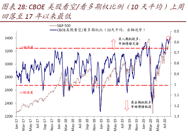 上周美股Put/call比率降至17年以来最低,黄金大跌后RSI降至合理水平。仓位上,黄金多头减少,欧元多头再创新高。