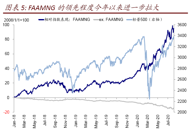 今年以来、特别是公共卫生事件之后,以FAAMNG为代表的美股龙头股迅速修复失地创出新高,与其他股票和板块的差距不仅没有收窄反而进一步扩大至多年新高;相比之下,美股其他板块如受公共卫生事件影响大的行业、以及金融周期板块等则持续跑输落后于市场。