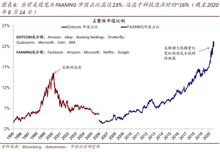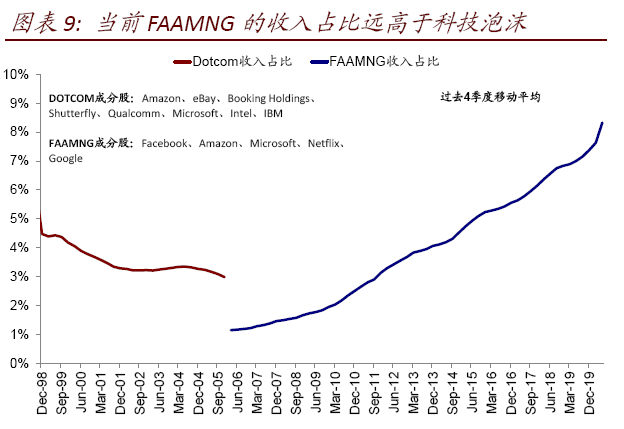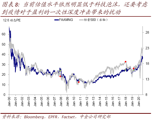 i. 当前估值水平远低于科技泡沫。即便考虑到此次公共卫生事件对于大部分企业盈利类似于一次性损益式的巨大冲击,当前FAAMNG和整体市场的动态估值也要明显低于2000年科技泡沫时的水平。随着复工后盈利逐步修复,我们认为当前估值的“异常值”也有望被初步“消化”。不可否认的是,货币当局为了应对此次公共卫生事件冲击采取的大规模流动性投放的确起到了助推估值的作用,但还远没到2000年科技泡沫时的泡沫程度。