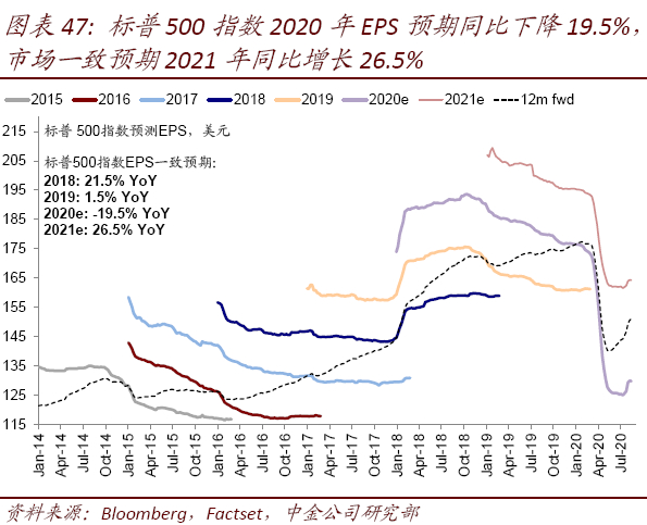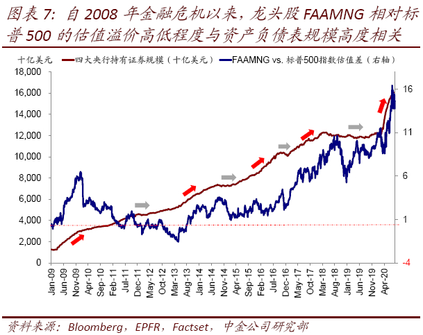 如我们在《再谈近期美股板块风格变化》分析的,我们以全球主要央行资产负债表的规模作为流动性衡量指标,发现自2008年金融危机以来,龙头股FAAMNG相对标普500的估值溢价高低程度与资产负债表规模高度相关。当资产负债表大幅扩张时,成长股相比整体市场的估值溢价往往大幅抬升,类似于公共卫生事件后的这一轮;反之,当资产负债表扩张步伐放缓甚至下降时,估值溢价则会有所收敛。