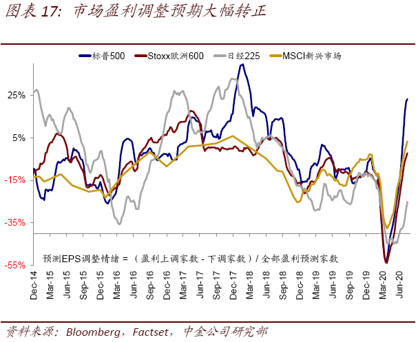 例如,上周首申人数3月以来首次降至100万以下;7月CPI继续回升,PPI环比转正且创2018年10月新高;7月零售消费恢复至公共卫生事件前水平,虽然环比不及预期,但扣除汽车后依然好于预期。此外,美股二季度业绩已经基本披露完毕,82%公司好于预期推动整体市场一致预期上修了全年EPS增长,且盈利调整情绪也明显转好。