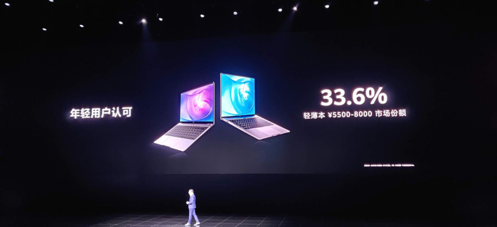 华为消费者业务大中华区副总裁、融合业务部部长李斌介绍了MateBook系列的MateBook 13和MateBook 14两款产品,他说,这两款产品在5500-8000价位段市场占有率达到了33.6%。