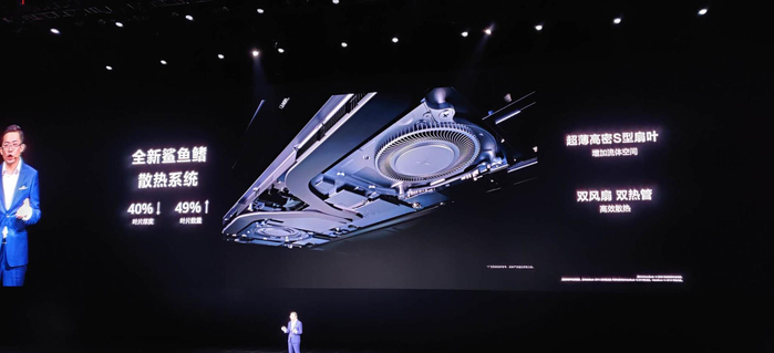 为了让性能充分释放,MateBook采用了新的散热系统,据称灵感来源于“鲨鱼鳍”,风量提升了33-39%。值得一提的是,在做到大风量的前提下,MateBook风扇的噪音控制在了25db,据称这采用了华为自研的滤波静音技术。