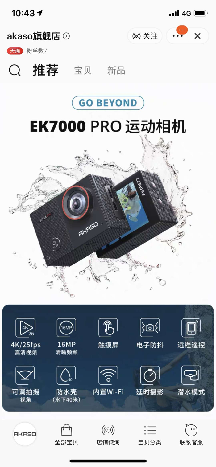鞭牛士报道 8月19日消息,AKASO旗舰店已在天猫平台正式上线,此前AKASO发布的第一款产品就是在亚马逊销量第一的EK7000 Pro,目前在天猫上售价人民币399元,支持6期免息。