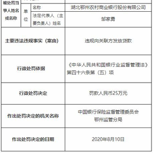 日前,湖北鄂州银保监局开出年内首份行政判决书,事涉鄂州农商行违规向关联方发放贷款,该行法定代表人邹家勇因此被罚款25万元。