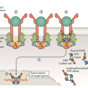 作为细胞质酪氨酸激酶家族的一员,JAK共有JAK1、JAK2、JAK3、TYK2四种亚型,亚型之间有重叠的结合对象。它们在多种I型和II型细胞因子受体的信号级联中具有重要的作用,由JAK介导的信号通路与细胞增殖、分化、凋亡以及炎症等过程有关。这些细胞因子或生长因子与细胞膜上相应的受体结合形成二聚体,使得胞质内JAKs发生聚集,临近的JAKs互相磷酸化而被激活。