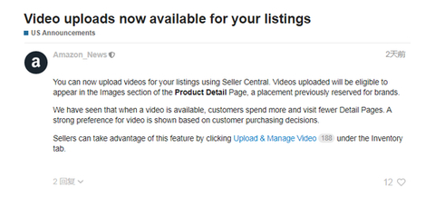 前段时间,小编曾报道过亚马逊非品牌卖家可以在商品主图后添加广告视频这则信息,随后有卖家表示,当时只有美国站有这个功能,并且也不是所有美国站的非品牌卖家都可以用。但是两天前,亚马逊正式发布通知称,该功能向所有非品牌卖家开放,并且其他站点也将陆续开放!