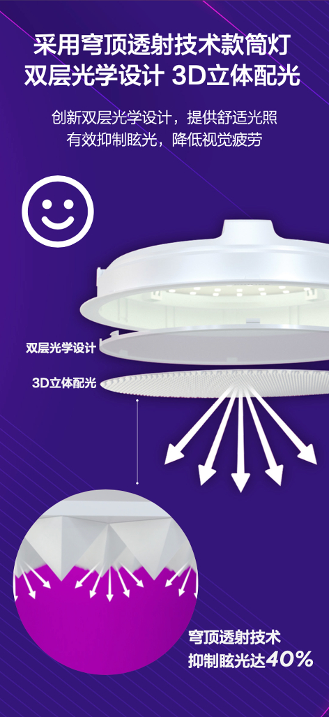 全新穹顶透射技术的应用由飞利浦LED灯泡延续至全新上市的飞利浦闪耀LED筒灯臻视版,配合双层光学设计和3D立体配光,拥有超薄一体式设计,能有效缩减天花高度,提升可利用空间。同时,大发光面的光源能让出光更均匀,光照范围更敞亮。