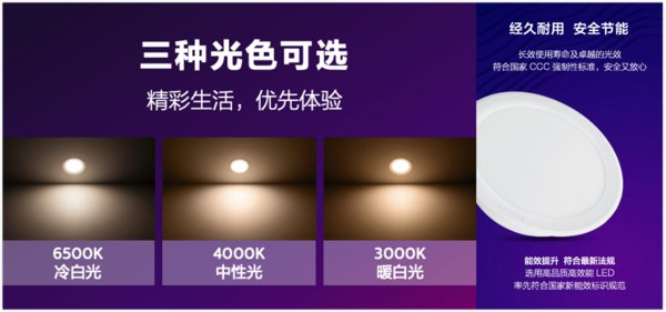 飞利浦闪耀LED筒灯臻视版共有三种光色可供选择,契合不同家装需求打造不同的居家氛围,为每个家提供高品质、高效能的灯光环境。