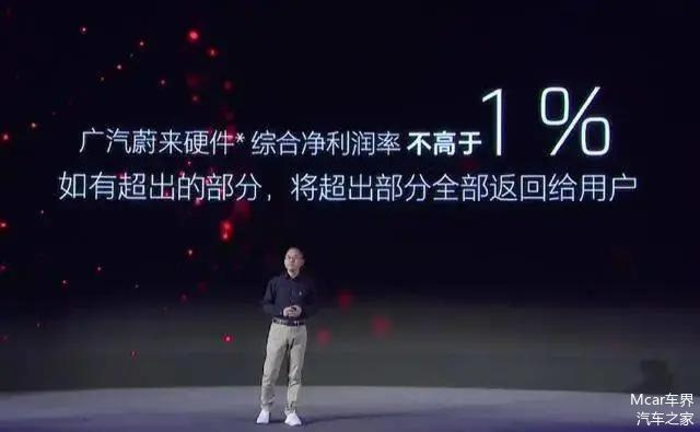 按广汽蔚来的说法,如果硬件综合利润率超过1%,公司会将超出部分全部返还给用户。如此大胆的动作在全球车企中尚属首例——特斯拉虽然希望通过卖软件挣钱,但并没有承诺过"硬件不赚钱"。