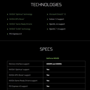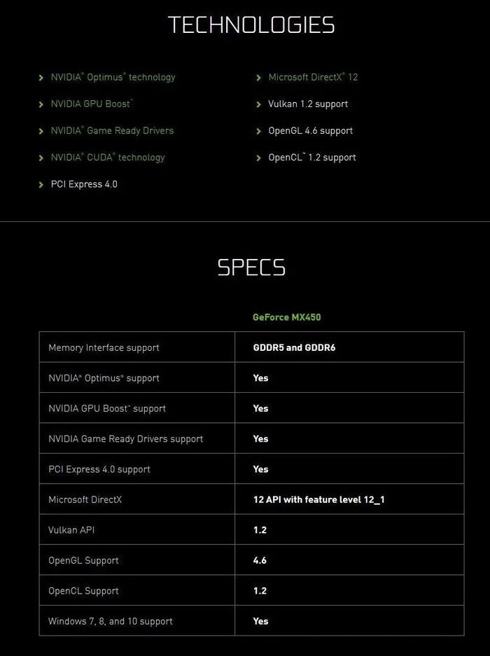 根据官方的信息,MX450支持CUDA技术、Optimus技术、GPU Boost技术、Game Ready驱动、DX12(Feature Level 12_1)、OpenGL 4.6、Vukan 1.2、OpenCL 1.2。