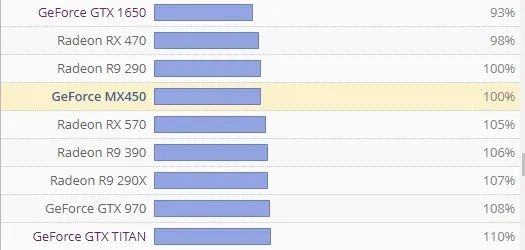TechPowerUp将MX 450与去年发布的GTX 1650做了对比,表示去年四月发布的GTX 1650显卡拥有相当于MX 450 93%的理论性能;AMD核显Vega 8仅有MX450四分之一的性能;而与2013年发布的GTX TITAN相比,GTX TITAN可具有MX450 110%的性能。