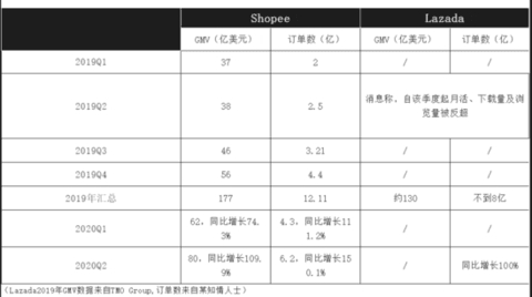 我们再来看看到同样作为东南亚头部的电商平台Shopee。由于母公司Sea集团是美股上市企业,Sea会在每个季度都会公布作为其特色的电商业务业绩亮点。下面猴哥来带大家对比一下两大公司2019-2020的GMV与总订单数。
