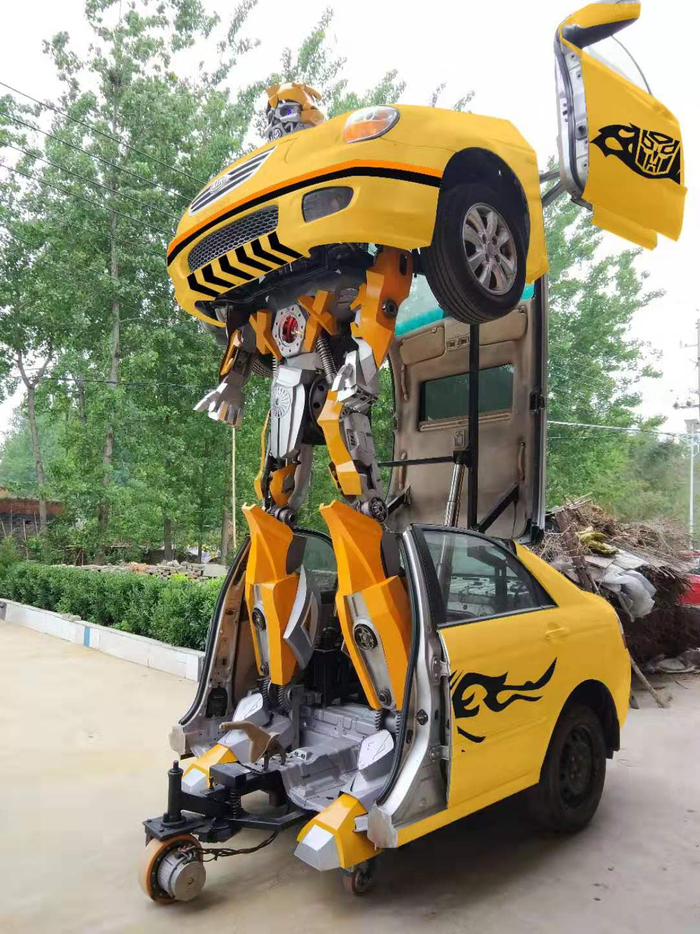 2018年,王燕兵回到湖北老家,开始变形金刚“大黄蜂”的创作。他买了一辆报废的小汽车,拆除汽车内饰让它变成空壳,再运用以前模具设计的经验进行建模。反复模拟、修改4个月后,王燕兵将“大黄蜂”各部分零件图纸打印出来,再按照图纸一点点焊接、安装。