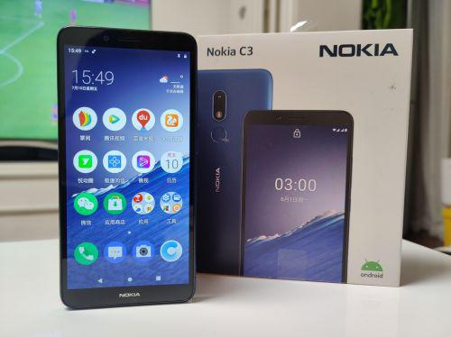 诺基亚C3搭载了一块上有额头下有下巴的非全面屏,上面设计了听筒和前置镜头,下面是诺基亚品牌Logo,屏幕尺寸为5.99英寸,分辨率为HD+级别,屏幕显示效果足够清晰细腻。