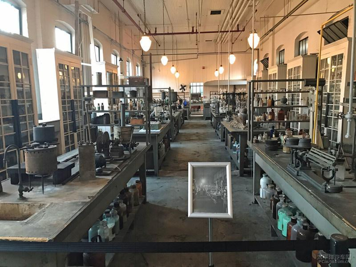 复原的爱迪生洛帕克实验室,左边试验台上摆着爱迪生发明的镍铁电池