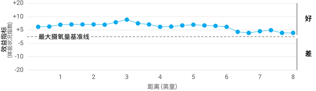 除了作为跑步前期的警示外,你还可将效益指标加入到设备的训练数据栏中,并在跑步时留意这项数据。它将会告诉你以目前的配速跑步时,你是否跑得比平时费力。效益指标可提早给你“撞墙期”的警示,让你能够在进入痛苦的撞墙期前调整策略。一般来说,搭载了心率计的Garmin腕表和Garmin心率带都支持这项功能。