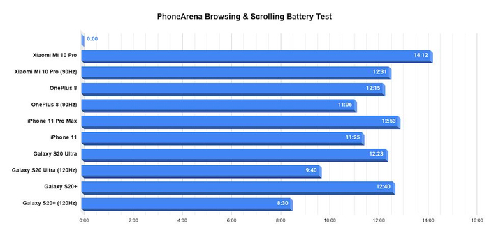 作为耗电大户,屏幕对于高刷新率的影响是可见的,以PhoneArena测试的结果为例,采用4000mAh以上电池的安卓旗舰,其高刷新率的开关与否,可以影响2-4小时的续航时间,重度使用续航差距明显。