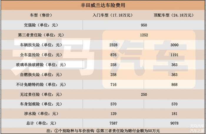 在车型的选择上,丰田威兰达共计推出12款车型,售价区间为17.18-24.18万元。由于个别险种会与车价挂钩,由表格可以看到,威兰达的入门版车型的保险费用为7587元,顶配版车型的保险费用为9078元。当然如果没有出险的话,后面的保险是会逐年下降的,因为这里算的是全险,所以会比较贵一些,我们就姑且先算每年的保险是7587元。