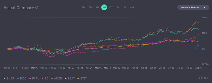 在过去六个月的时间里,电子商务类的股票也出现了暴涨: