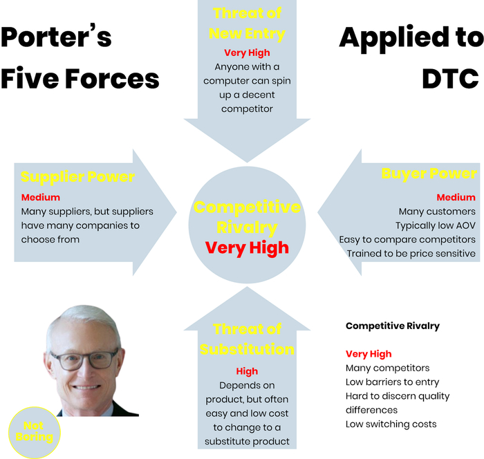 价值链分析和波特五力模型解释了当今的DTC格局,并为易事的不易之处提供战略框架支持。