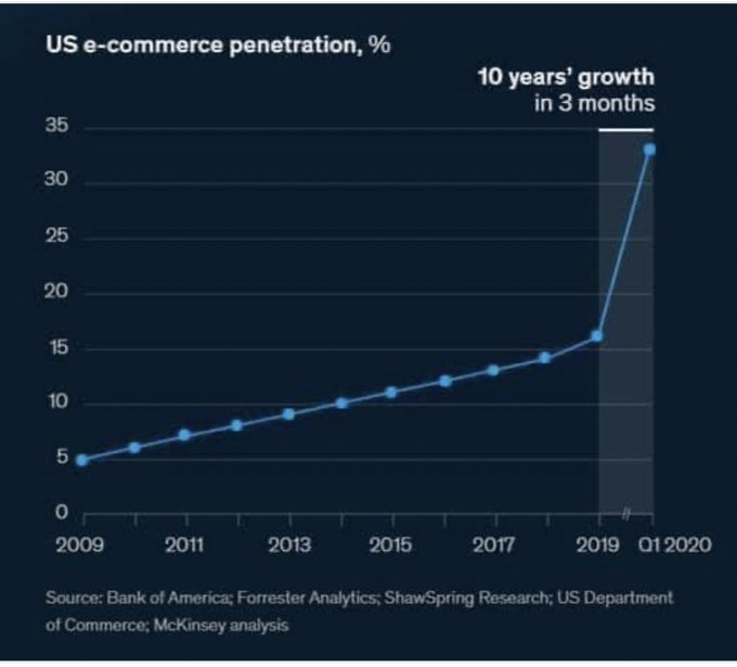 我来透露一个秘密,电子商务行业会感到非常兴奋:COVID只用3个月的时间就实现了电子商务过去十年在渗透率方面所取得的成就。