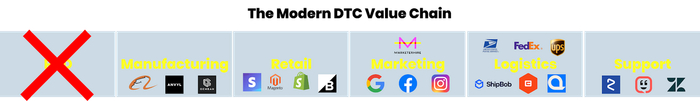 首先,我们先来看一下DTC的价值链,这是公司为了将产品直接交付给消费者而进行的一系列离散而又相关的活动。