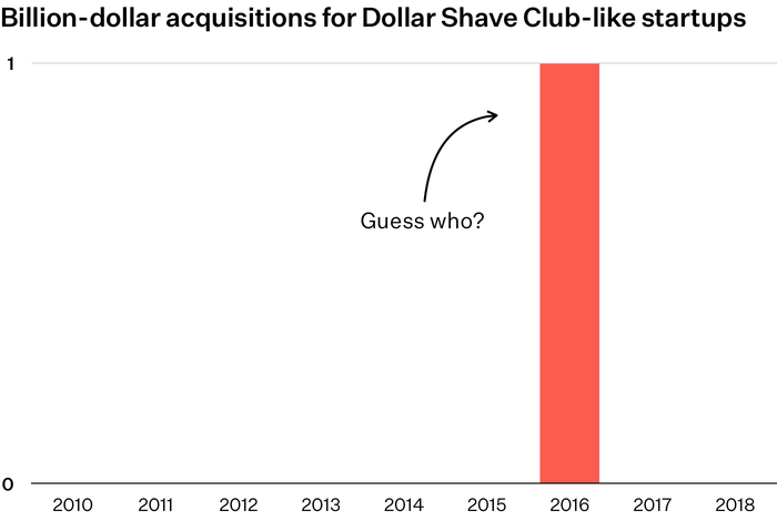 剃须刀是证明这条规则的例外是有原因的:全世界高质量的剃须刀制造商用手指就能数得过来——宝洁(P&G)掌握了一个, Edgewell拿到了一个, Harry’s握有Feintechnik ,此外还有两三个。而已。由于供应有限且难以获得,剃须刀的先行者具有巨大的优势。独特的价值链带来独特的产出。在《新消费者》中, Dan Frommer画出了这种包括所有十亿美元级DTC退出的图表。