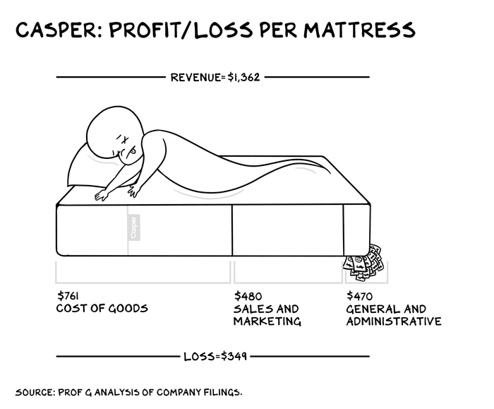 当然,这是典型的G教授风格,这种算法太夸张,是不对的——761美元的销售成本加上300美元的现金意味着每张床垫要亏损1061美元,而Casper在IPO时的亏损只有349美元——但这种说法是成立的。缺乏差异化的产品,由于资本结构的增长要求,以及面对Shopify 武装起来的竞争对手的冲击,Casper和Blue Apron别无选择,只能动用自己的战争基金来获取客户。