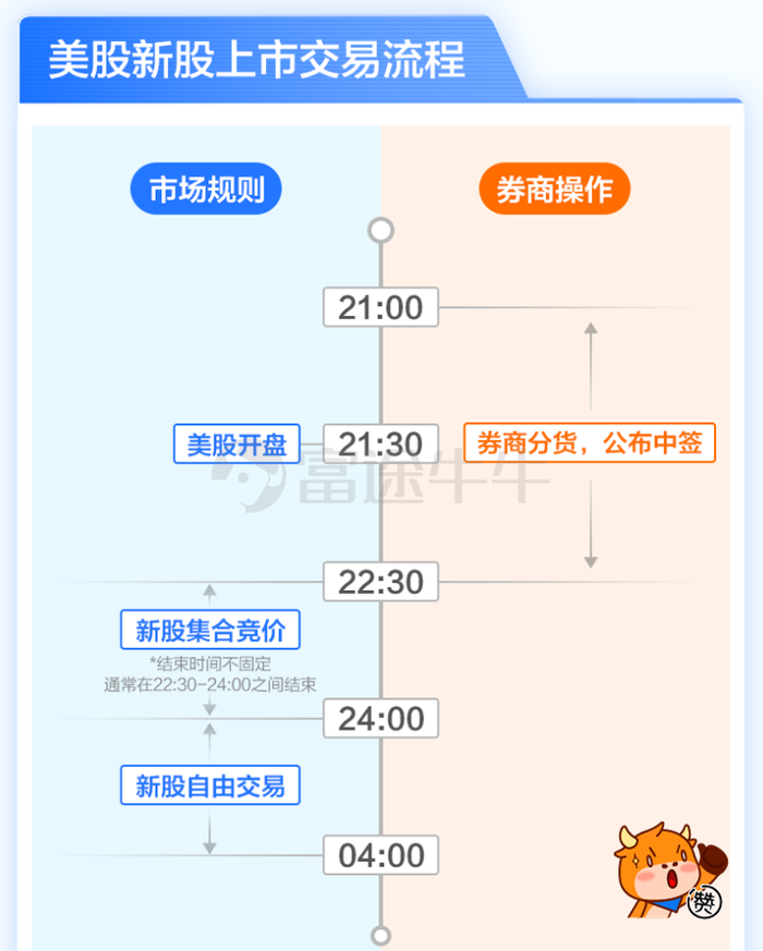 上市首日开始交易的时间并不固定,美股开盘后的一段时间内为新股的集合竞价时间,新股将会在这半小时至2小时内随机开盘。