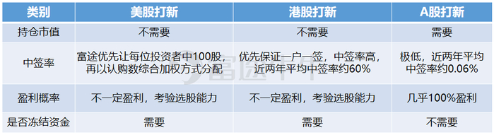 总体来看,美股打新可以对标港股打新,不需要持仓市值,中签率较高,不一定盈利,以及申购时需要冻结资金。