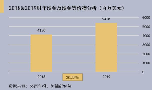 公司现金及现金等价物从2018年的41.50亿美元增长至2019年的54.18亿美元,同比增长30.55%,公司现金流状态良好。