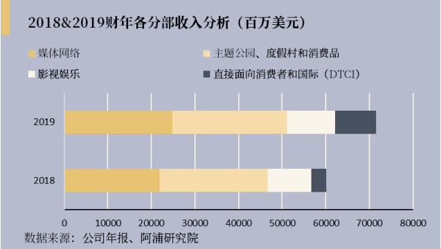 迪士尼是一家多元化的全球娱乐公司,其业务涉及以下领域:媒体网络;主题公园、度假村和消费品;影视娱乐;直接面向消费者和国际(DTCI)。2019财年迪士尼总收入达695.70亿美元,同比增长17%。其业绩的增长主要由直接面向消费者和国际(DTCI)分部收入推动。