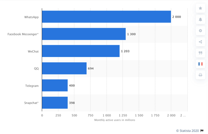 图注:WhatsApp 及 Facebook Messenger 是全球排名第一及第二的即时信息应用程序(来源:Statista)