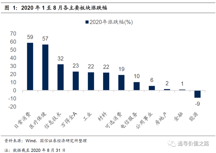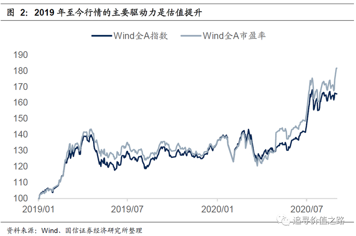 从行情的驱动力来看,这两年的行情可以归纳为「生拔估值」行情,即指数的涨幅主要是由估值提升驱动。对比指数价格与市盈率的走势,很容易可以发现这点,考虑到去年全年全部A股盈利增速非常低,而今年由于疫情影响截止中报全部A股公司盈利是负增长的,实际上,市场整体估值提升的幅度要大于指数的涨幅。